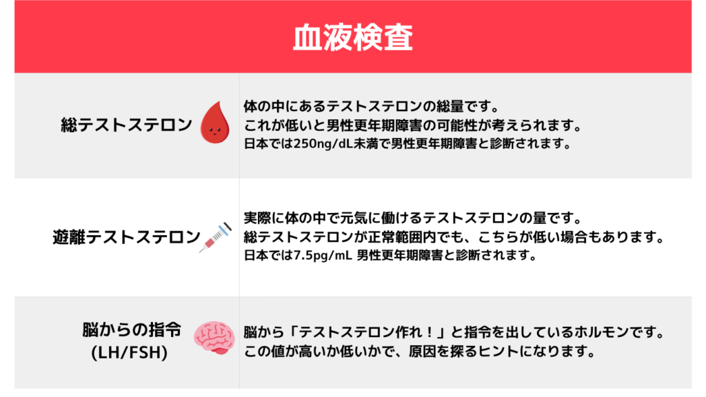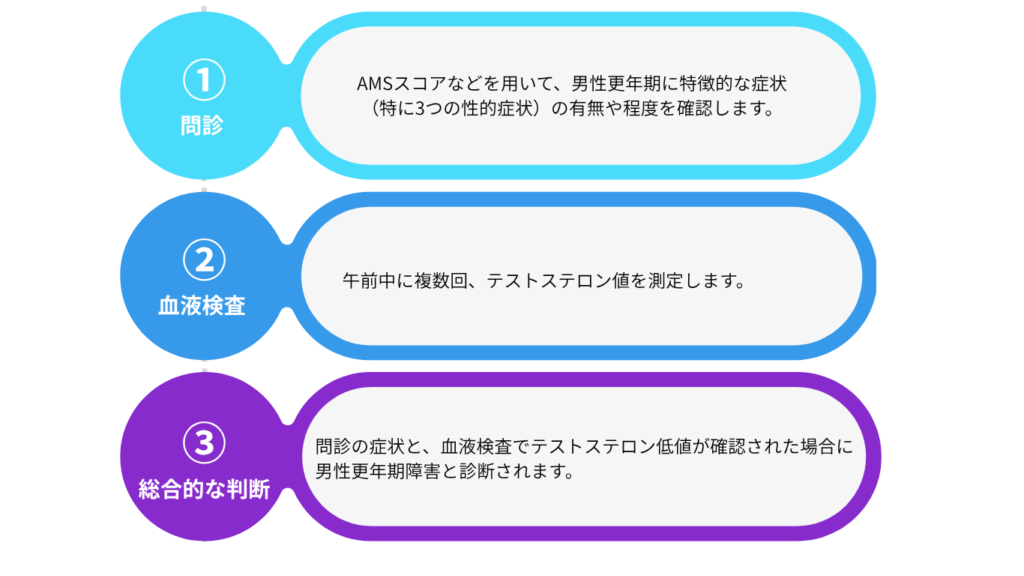 国際的な研究では、これらの症状が3つ揃い、かつ血液検査でテストステロンの低下が確認された場合に男性更年期と診断されることが多いと報告されています。