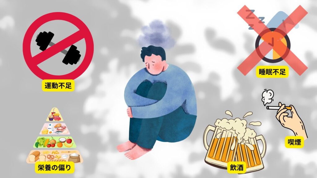 お酒の飲みすぎはホルモンの働きを妨げ、タバコは血流を悪化させ、テストステロン低下の原因になると考えられています。