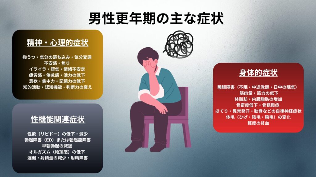 男性更年期の症状は多岐にわたりますが、特に診断の決め手となりやすいのが