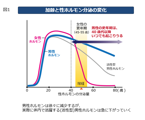 ピンク色の女性ホルモンは閉経前後に急激に低下するのに対し、青色の男性ホルモンは緩やかに低下しているのがわかります。