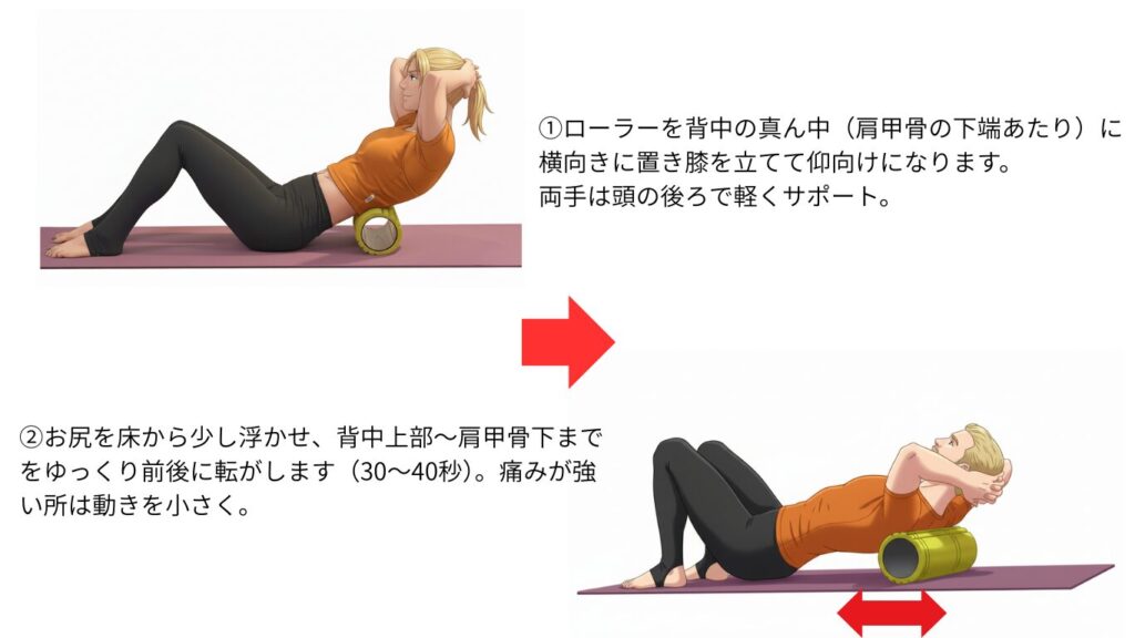 ② 肩甲骨ほぐし | 胸・背中上部 | 3分 | 巻き肩対策/胸郭を開いて呼吸量UP | フォームローラー |