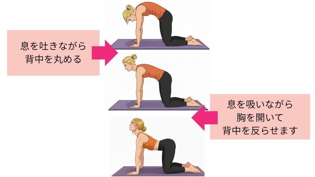 - 四つ這いになり、息を吐きながら背中を丸め(キャット)