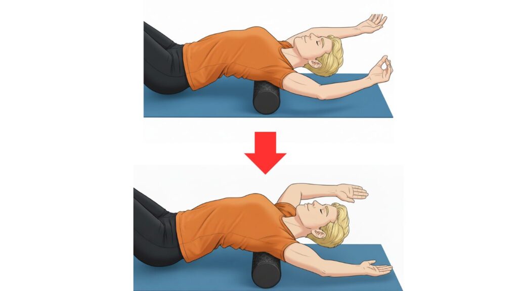 ローラーを肩甲骨の真下に置いたまま、両腕を床に「W字→Y字」と滑らせるように開閉(各5回)。