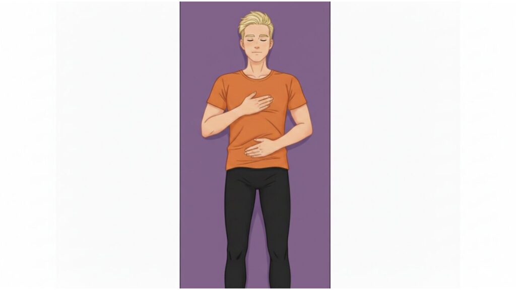 - 仰向けに寝て、片手を胸、もう片手をお腹に置きます。