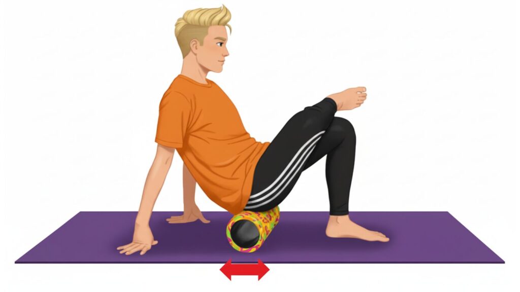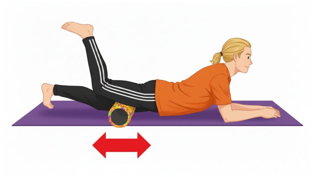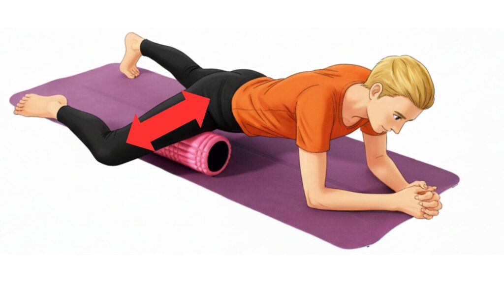 うつ伏せで片ももをローラーに乗せ、肘で支えながら膝の上〜骨盤手前までゆっくり往復(左右各40秒)。