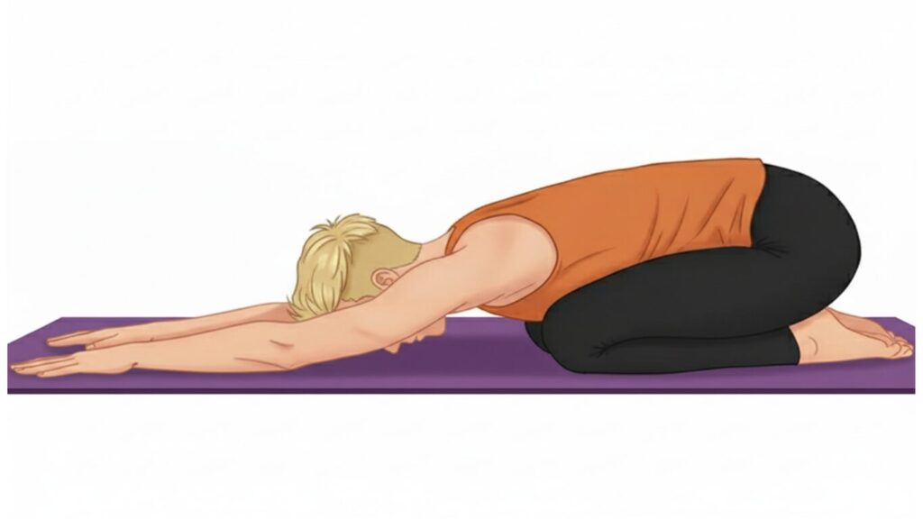 お尻をかかとに近づけ、腕は前に伸ばし、鼻で4秒吸う→口で6秒吐くを4呼吸。